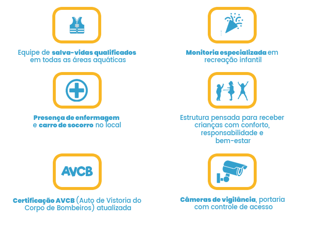 Diversão com segurança com piscinas rasas, salva-vidas e monitoria qualificada